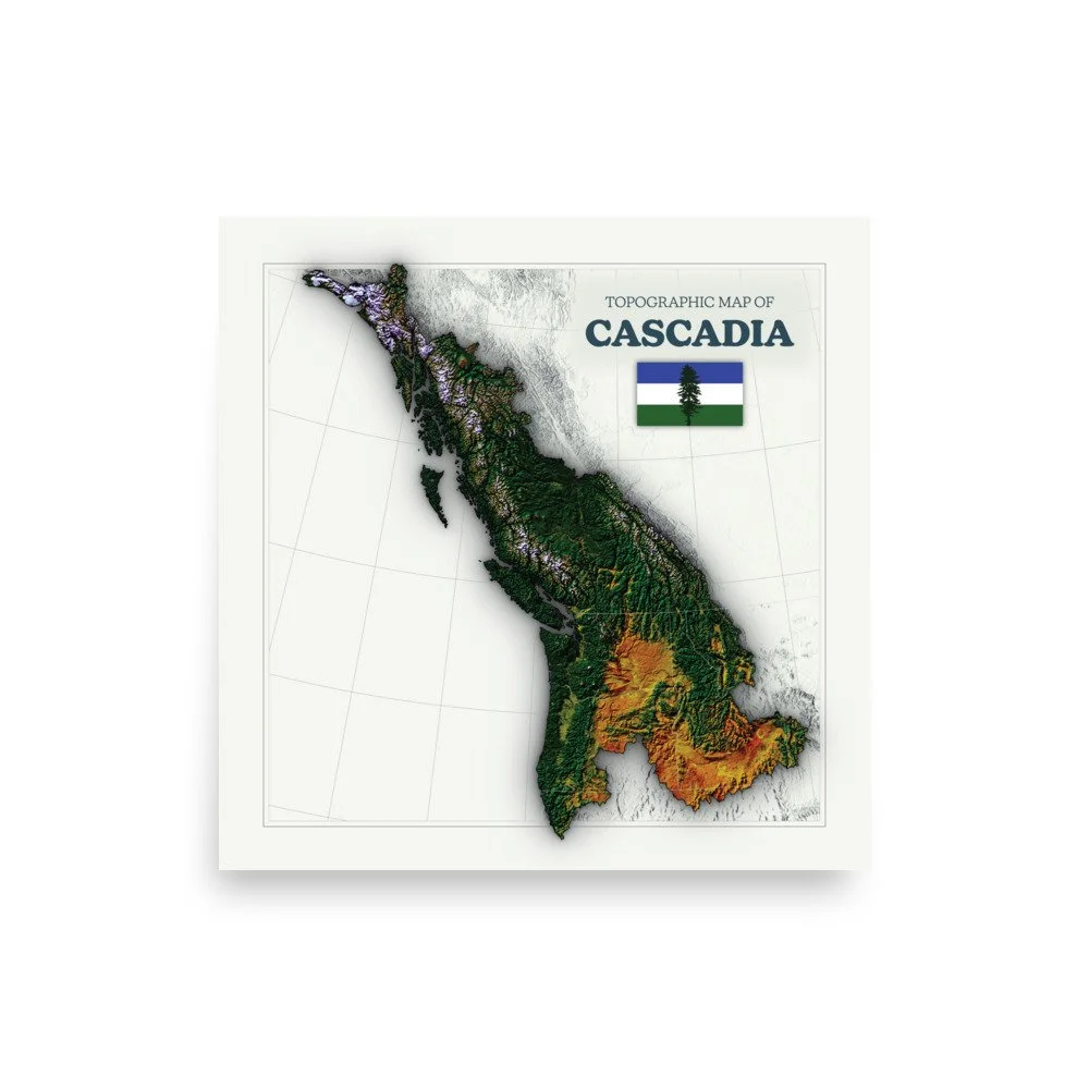 Cascadia is one of my favorite cultural geographic regions. Spanning from Northern California to northern British Columbia and Alaska, this place doesn't exist on any political map. Despite this, the idea has persisted for decades. Not necessarily as a secessionist movement (though there are traces of that), but merely as a recognition that this place is different. As such, I decided to make a lovely topographic map to celebrate the one and only Cascadia.